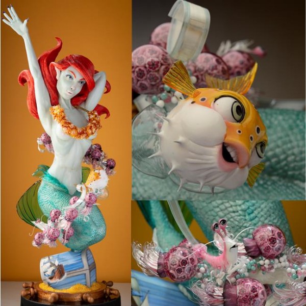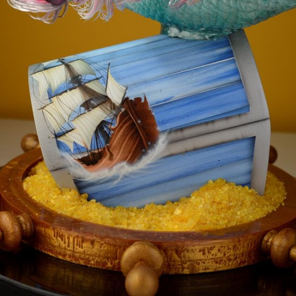 - une peinture à l’aérographe sur pastillage, une fleur d’exception en sucre tiré, un sujet en sucre soufflé, des éléments en sucre pour agrémenter la pièce artistique (en sucre coulé, pastillage, soufflé, et Pastillage peint).