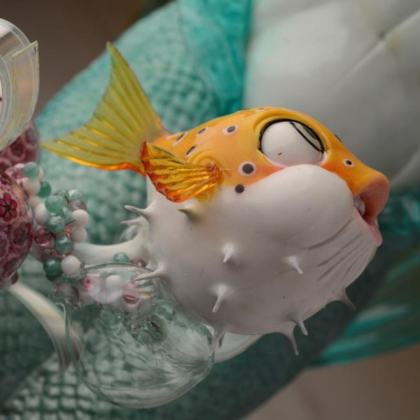- Souffler une partie de la masse avec une pompe à sucre (comme les verriers de Murano) afin d’obtenir une pré-forme pour le confection d’un animal ou d’un tête pour un personnage.